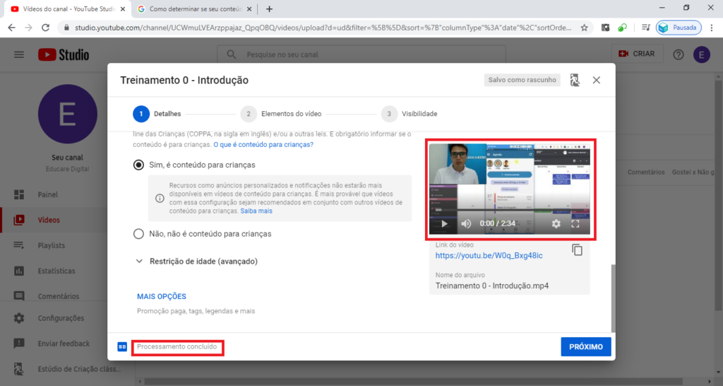 É hora de editar o título do vídeo, criar uma descrição e marcar se há alguma restrição infantil ao conteúdo. Como se trata de uma vídeo-aula, marque que o vídeo é conteúdo para crianças. Não é necessário mexer nas opções avançadas desta tela.