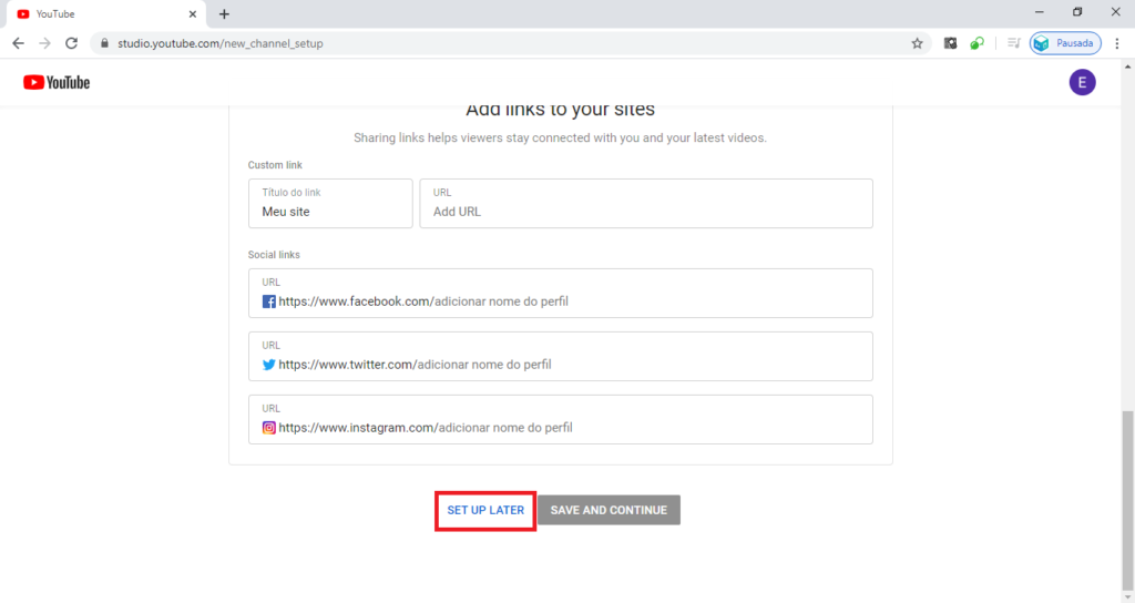 Se não for o seu caso, clique em set up later (preencher mais tarde).